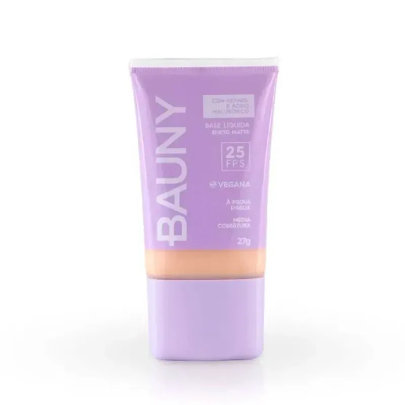 A <strong>Base Líquida Bauny Cosméticos Matte FPS 25 Cor 020 27g</strong> é uma base facial líquida de acabamento matte ideal para quem busca <strong>pele uniforme, sem brilho e com longa duração</strong>. Sua fórmula avançada combina <strong>ácido hialurônico</strong> e <strong>retinol</strong>, promovendo <strong>hidratação profunda</strong>, cuidado antienvelhecimento e renovação da textura da pele enquanto você se maquia. Essa base oferece <strong>cobertura média ajustável</strong>, que pode ser construída conforme a necessidade, controlando o excesso de oleosidade e proporcionando um efeito natural e elegante durante todo o dia. Enriquecida com <strong>proteção solar FPS 25</strong> e ativos antipoluição, protege sua pele contra raios UVA/UVB e agressores do ambiente urbano, garantindo conforto, resistência ao suor e acabamento impecável mesmo em climas desafiadores. A fórmula vegana à prova d’água confere alta durabilidade, tornando essa base perfeita para o seu uso diário, celebrando a beleza com toque aveludado e uniforme em todas as ocasiões.