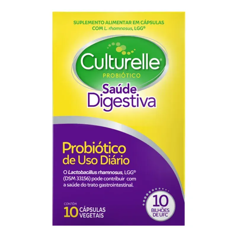 Culturelle Probiótico é apresentado em embalagem com 10 cápsulas e foi desenvolvido para auxiliar na manutenção da saúde intestinal e do equilíbrio da flora intestinal. Cada cápsula contém cepas de probióticos selecionadas, contribuindo para o bom funcionamento do sistema digestivo e suporte ao bem-estar geral. O uso deve seguir as instruções do fabricante ou orientação de profissional de saúde. O produto deve ser armazenado em local fresco, seco e protegido da luz, fora do alcance de crianças.