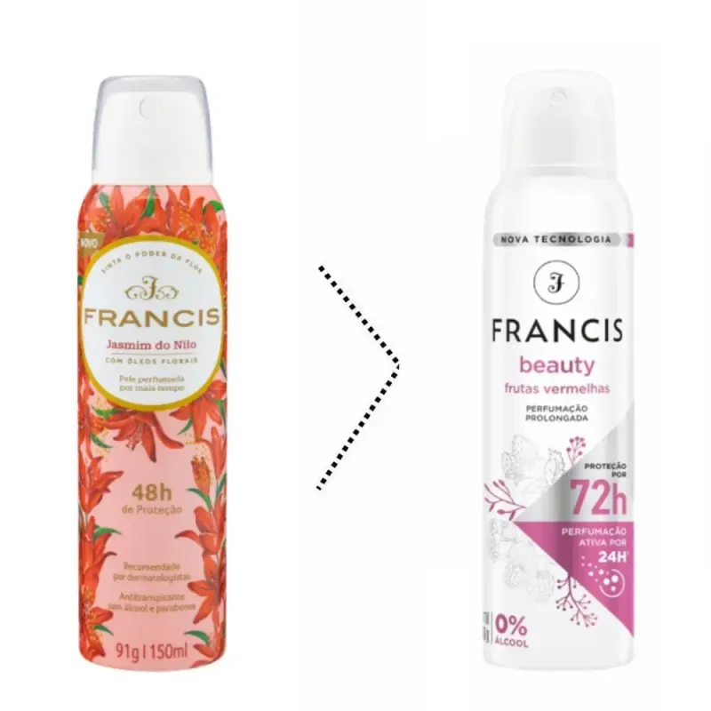 Desodorante Aerossol Francis Beauty. Imagem meramente ilustrativa. O produto pode ter variação de cor ou desenho, porém as características gerais são as mesmas especificadas na descrição do produto. AÇÃO/ATIVOS: Antitranspirante 48 horas, recomendado por dermatologistas.