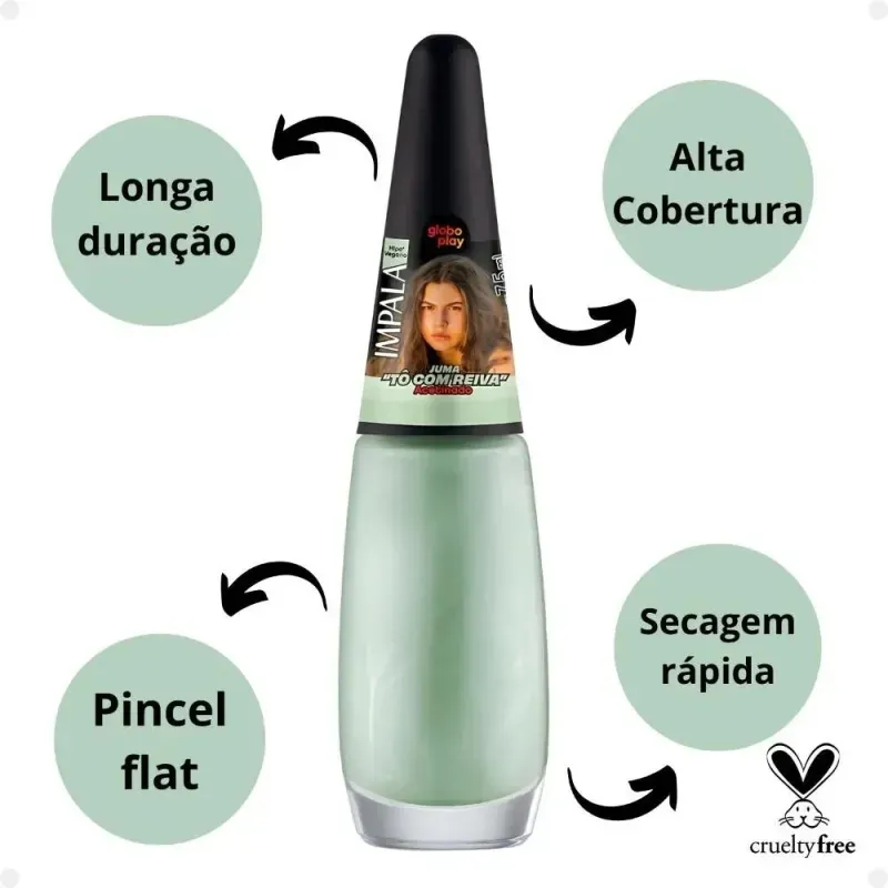 O Esmalte Impala Globoplay “Tô Com Reiva” 7,5 ml traz personalidade e irreverência em um tom verde pastel acetinado, inspirado nos memes e novelas icônicas da TV brasileira. Com acabamento moderno e toque sofisticado, essa cor expressa atitude e autenticidade, perfeita para quem gosta de se destacar com estilo.