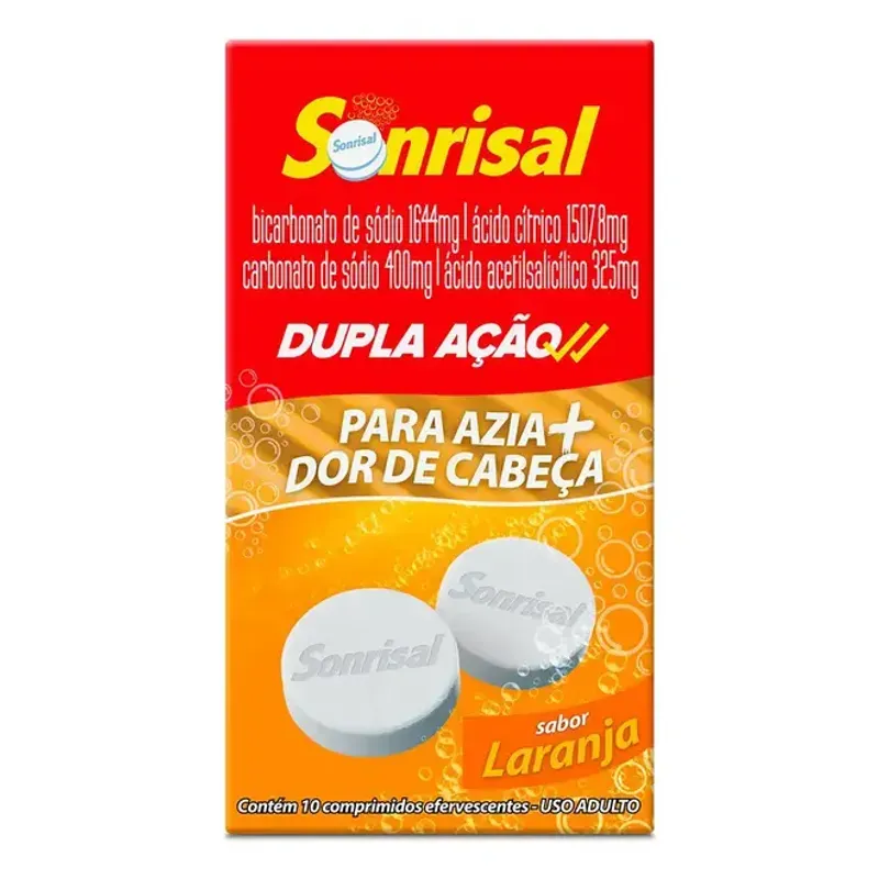 Sonrisal Laranja 10 comprimidos efervescentes oferece alívio rápido e eficaz da azia, má digestão e queimação estomacal. Sua fórmula efervescente age em segundos após dissolver na água, neutralizando o excesso de acidez e proporcionando sensação imediata de conforto. Com sabor agradável de laranja, o produto é prático para o dia a dia e ideal para quem busca uma solução rápida para desconfortos digestivos ocasionais. Cada comprimido garante ação antiácida eficiente, ajudando a restabelecer o equilíbrio do pH gástrico e favorecendo uma digestão mais leve. O formato efervescente facilita a ingestão e melhora a absorção, tornando o alívio ainda mais eficiente. Sonrisal é uma opção conveniente para quem deseja retomar o bem-estar de forma simples e imediata.